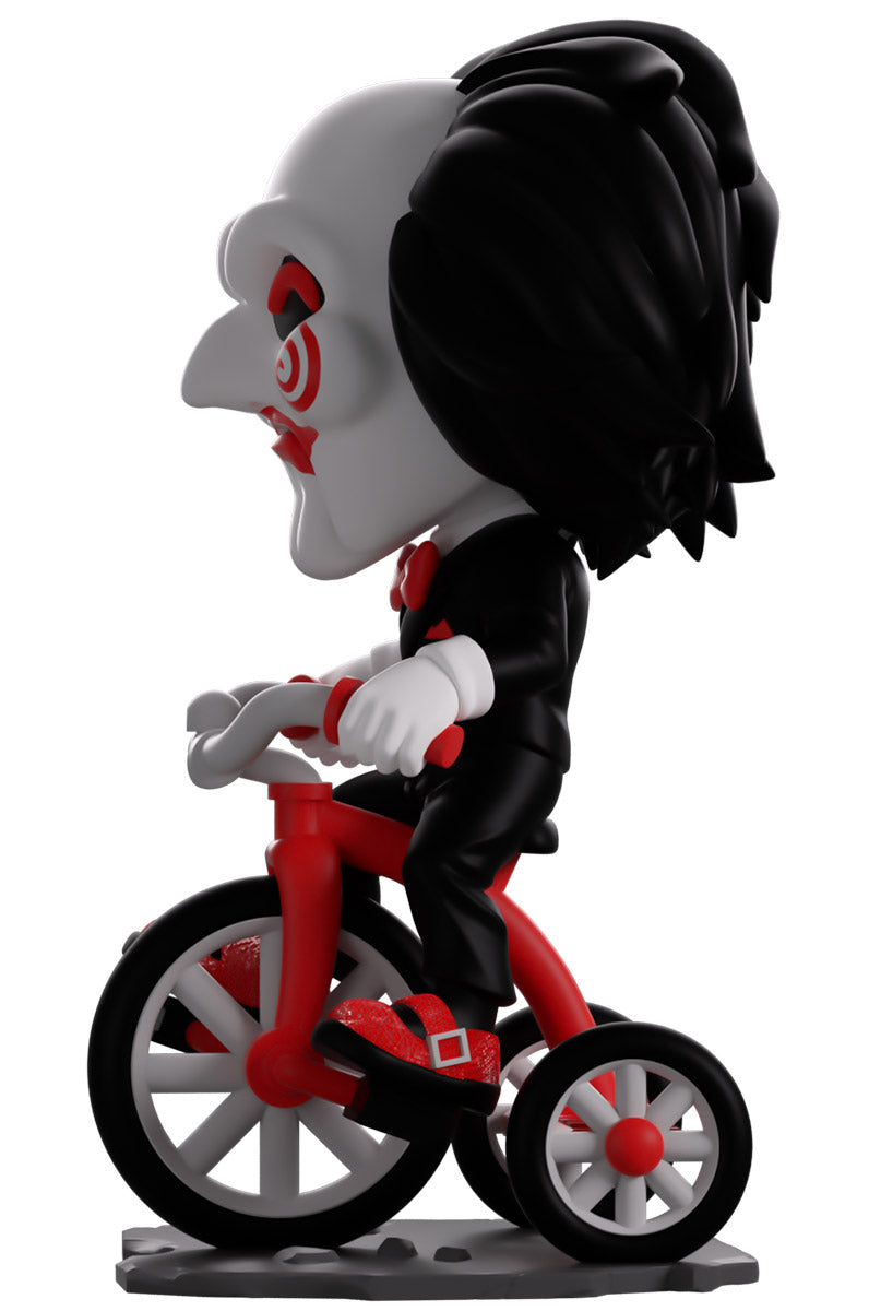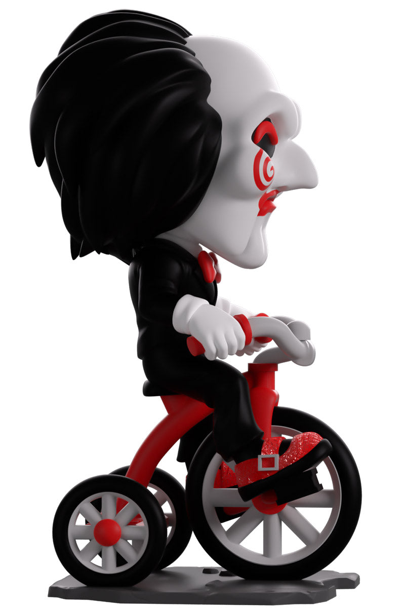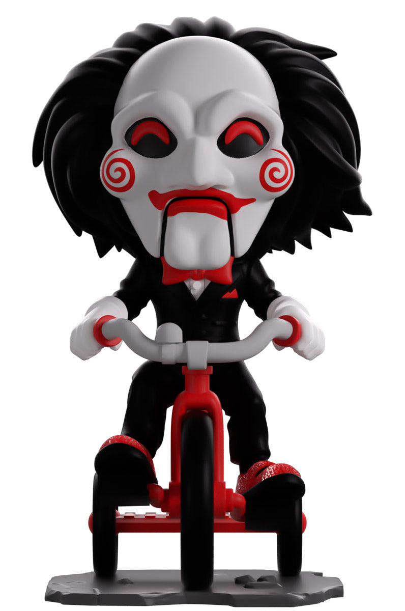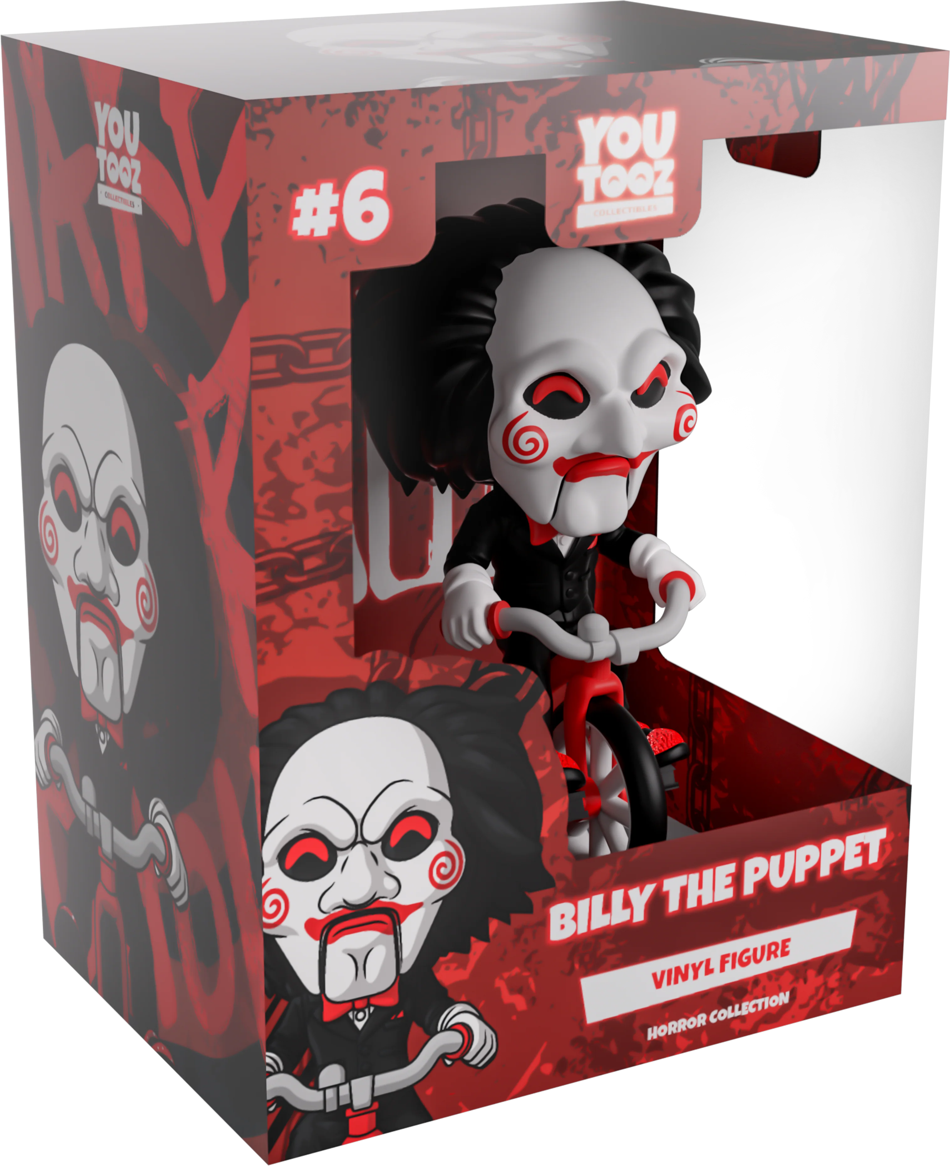Now this is one game we definitely want to play as Billy the Puppet makes their Youtooz debut! Ready to give you the ultimate challenge and riding in atop a bright red and grey tricycle at 5.2 inches tall with his white-gloved hands gripping the handlebars and a sparkling red shoe on each pedal, his long black hair sweeps back from a white mask as bright red pupils shine out from under a thick brow. With spirals on each cheek and the lines of his puppet mouth carved around bright red lips, he wears a slick black suit over a white shirt and red bowtie. The exterior of his packaging is black and blood red with a terrifying pig masking staring outward. The interior is covered in a splotchy blood red with a series of chains running across it, these then continue onto the protective sleeve where his figure can be seen through the large clear window at the packaging’s front. This collectible ships in a matte, embossed, protective outer sleeve and a custom-sized plastic protector for maximum protection during shipping.