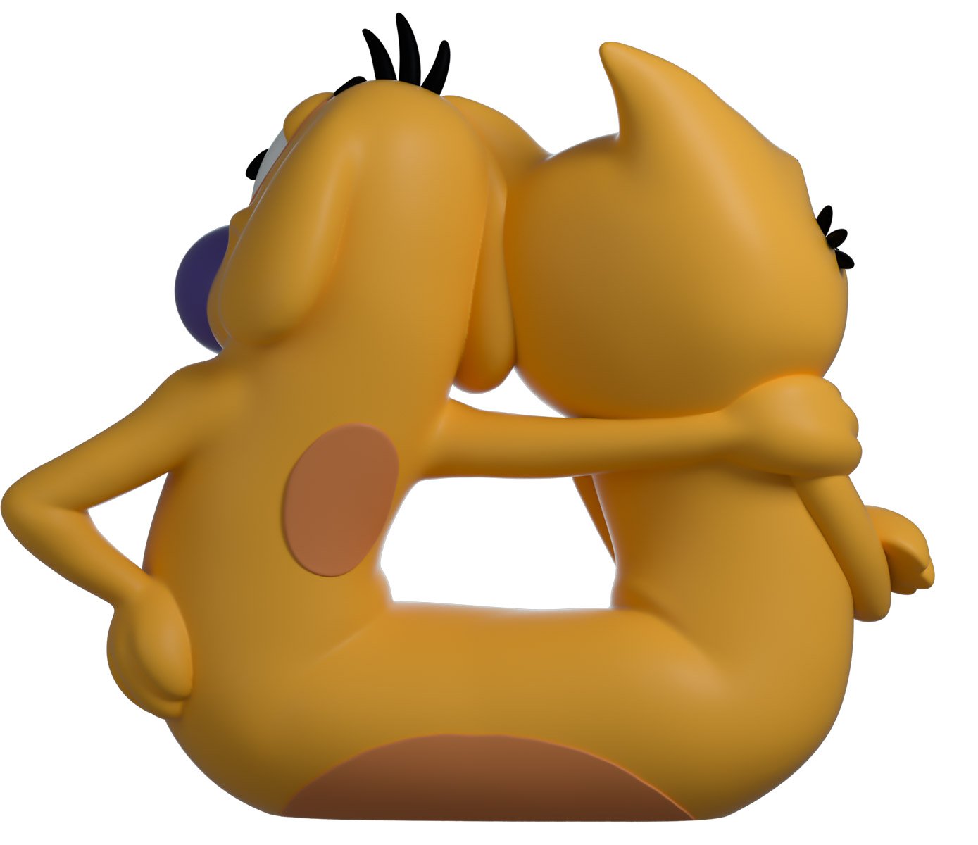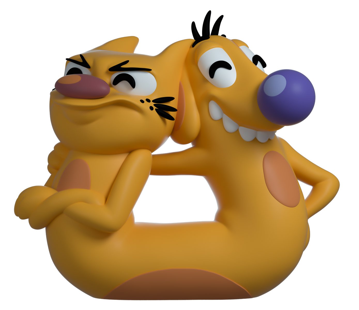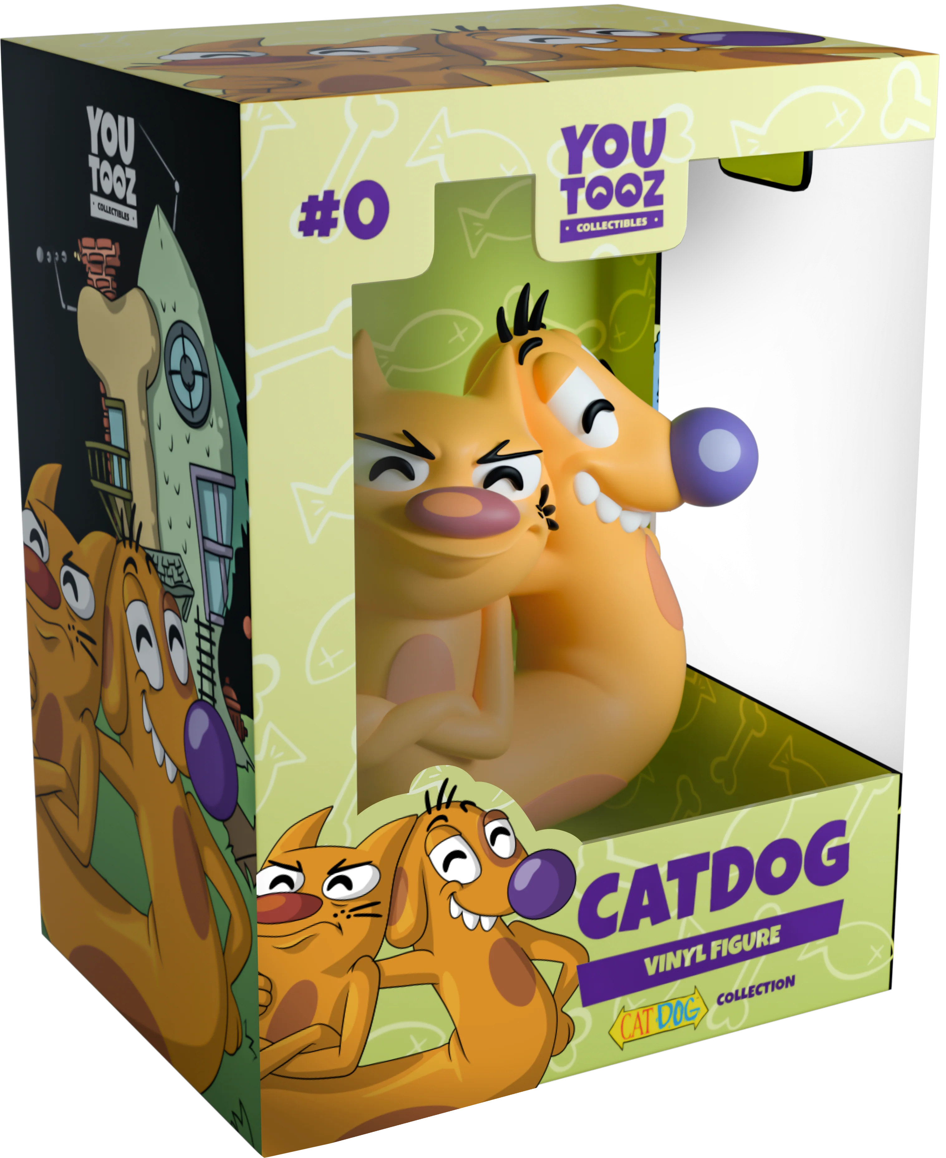 The infamous Catdog brothers have arrived to Youtooz! The conjoined brothers, one side Cat and the other side Dog, are always finding themselves in crazy situations. Posing together, the two stand at 3.4 inches. Cat is seen with an unamused smirk on his face, both of his arms crossed. Dog, on the other hand, is as happy as ever, with his right arm across Cat's shoulder and his left hand on his hip. The exterior of their window box showcases their small town with the building landscape as well as their home. The interior is a bright green background with a pattern of white bone and fish. The protective sleeve is a purple background with Cat and Dog's torso wiggling across. This collectible ships in a matte, embossed, protective outer sleeve and a custom sized plastic protector for maximum protection during shipping.