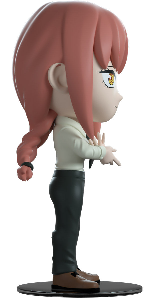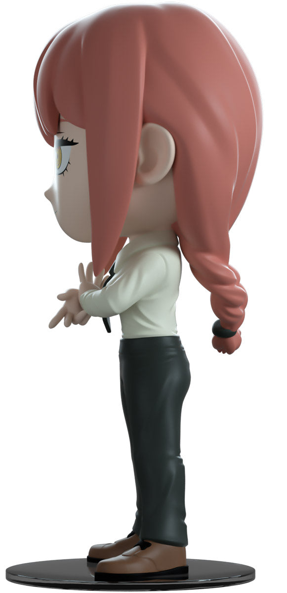 Makima is here to make her Youtooz debut, I’m sure there’s nothing out of the ordinary going on here! Standing at 4.4 inches tall her long peach colored hair is pulled to the back in a thick ponytail which flicks out the side while her fringe and two long strands of hair frame her face. With a calming look and a slight smile, her piercing yellow eyes stare straight at you as she makes a hand sign readying to unleash a Devil’s power! Always dressed for business (whatever that may be), she wears a white long sleeve shirt and black trousers along with brown shoes. The exterior of her packaging is a dark green stamped with kanji and splattered in a vibrant red spray which also covers the bright yellow interior. The protective sleeve shows a calm Makima making a hand sign in front of the red splatter that bleeds onto the green background as her figure can be seen through the large clear window at packaging’s front. This collectible ships in a matte, embossed, protective outer sleeve and a custom sized plastic protector for maximum protection during shipping.