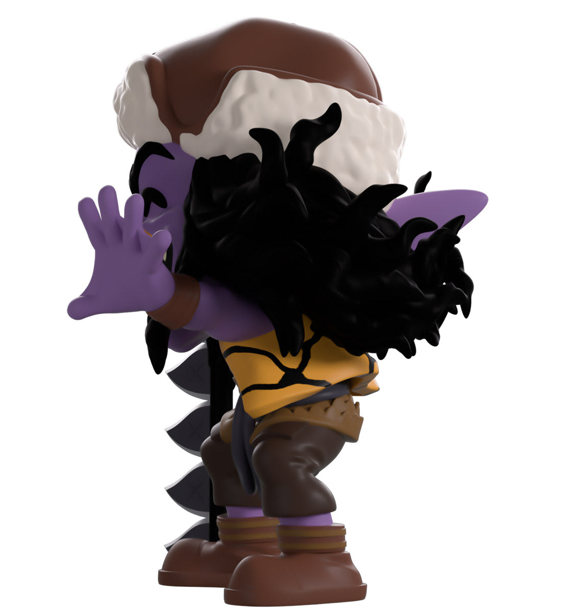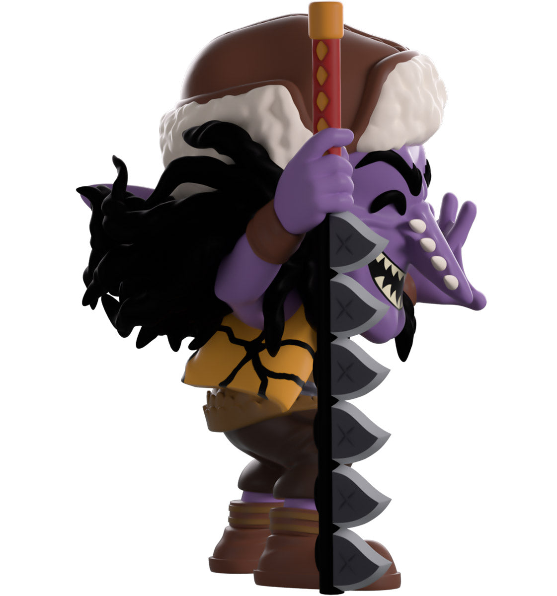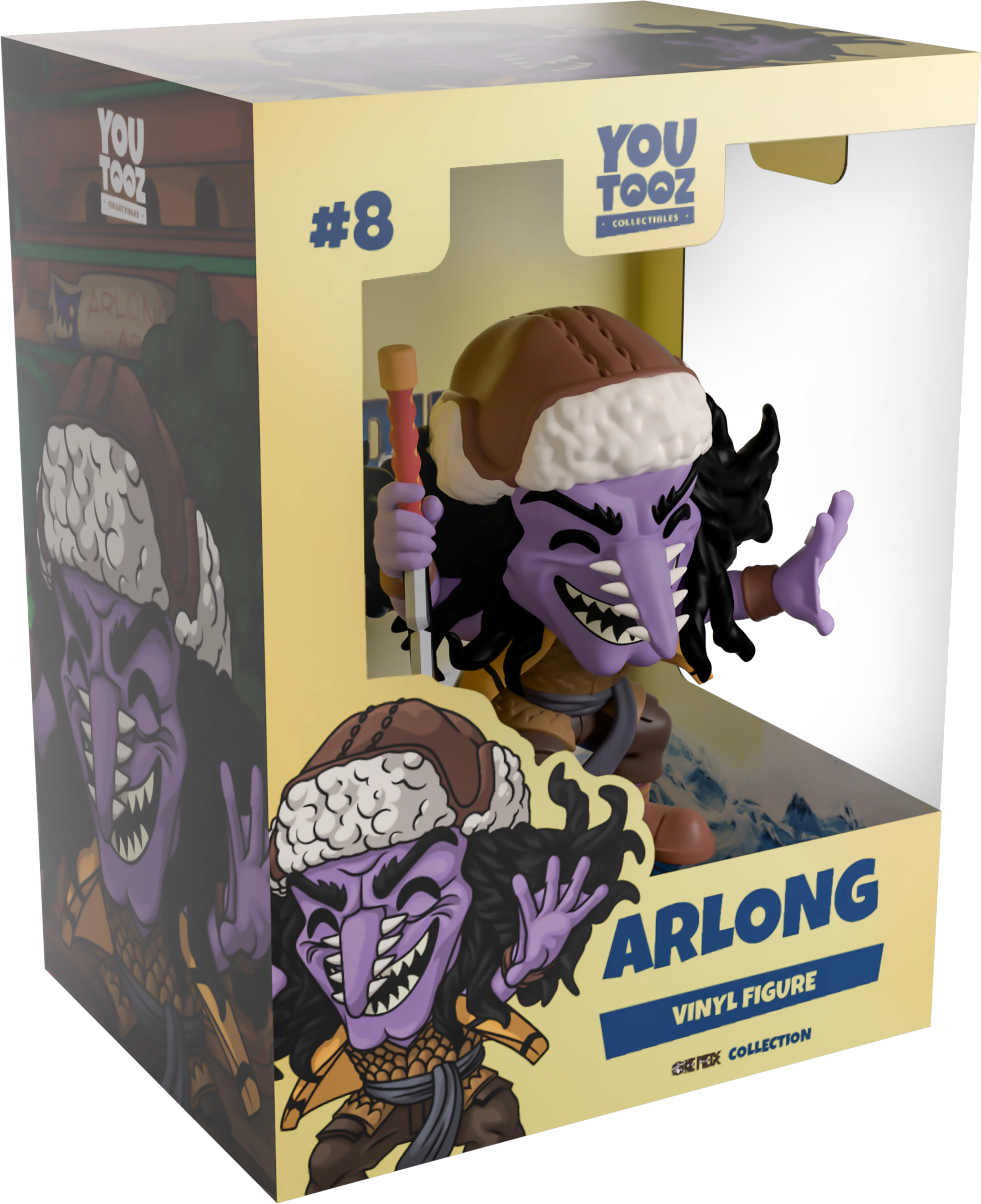 Arlong has swum his way into Youtooz to show everyone who’s the real king of the seas! Standing at 4.5 inches tall with a sharp-toothed smile stretching across his purple face underneath a long pointed nose as wild black hair flows out from under his brown and white hat. With an outstretched webbed hand and holding a long and devastating serrated sword planted in the ground at his side, he wears a yellow and black vest over his scaled top along with brown pants and shoes. The exterior of his packaging shows a deserted Arlong Park in the dead of night. While the interior sees a vibrant blue crashing wave sending white sea foam skywards in front of a beautiful pale yellow background, this design then flows onto the protective sleeve where his figure can be seen through the large clear display window at its front. This collectible ships in a matte, embossed, protective outer sleeve and a custom-sized plastic protector for maximum protection during shipping.