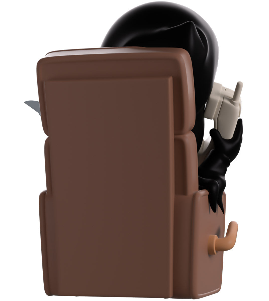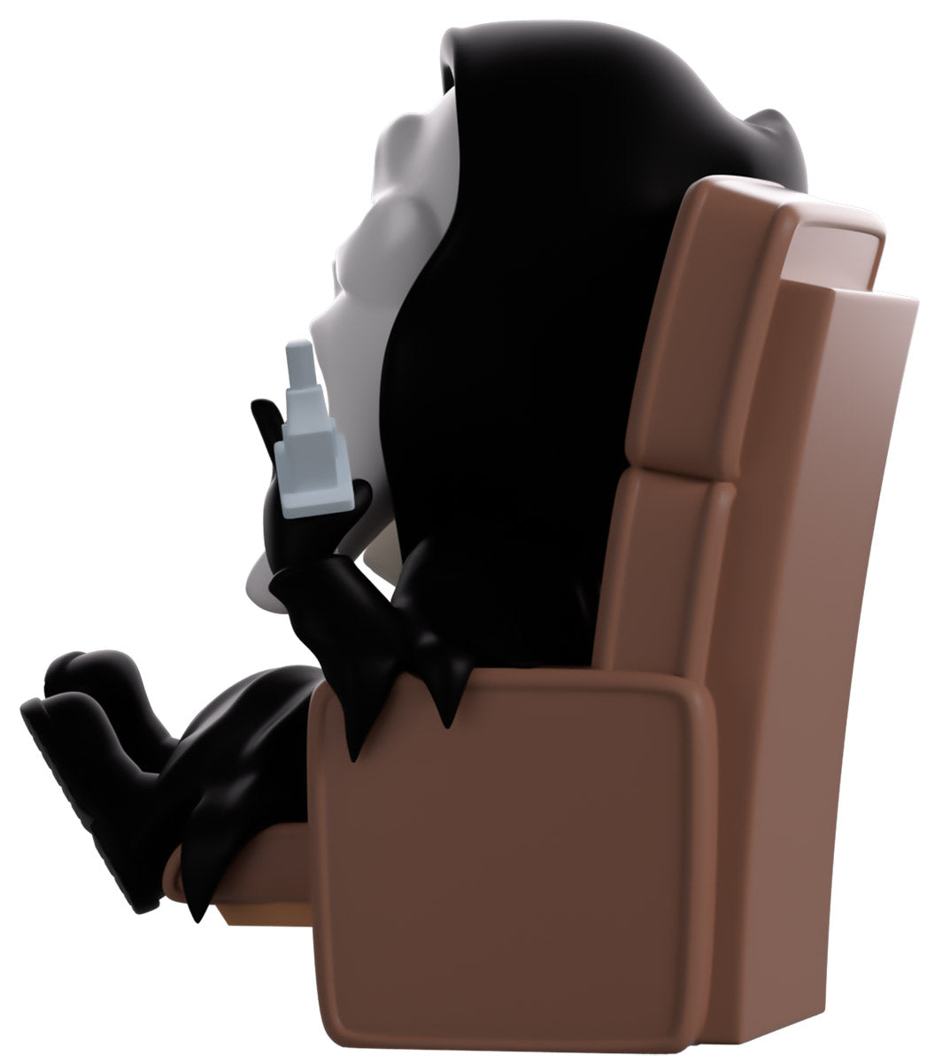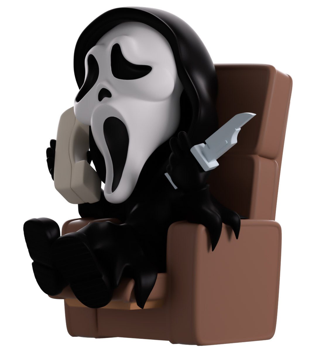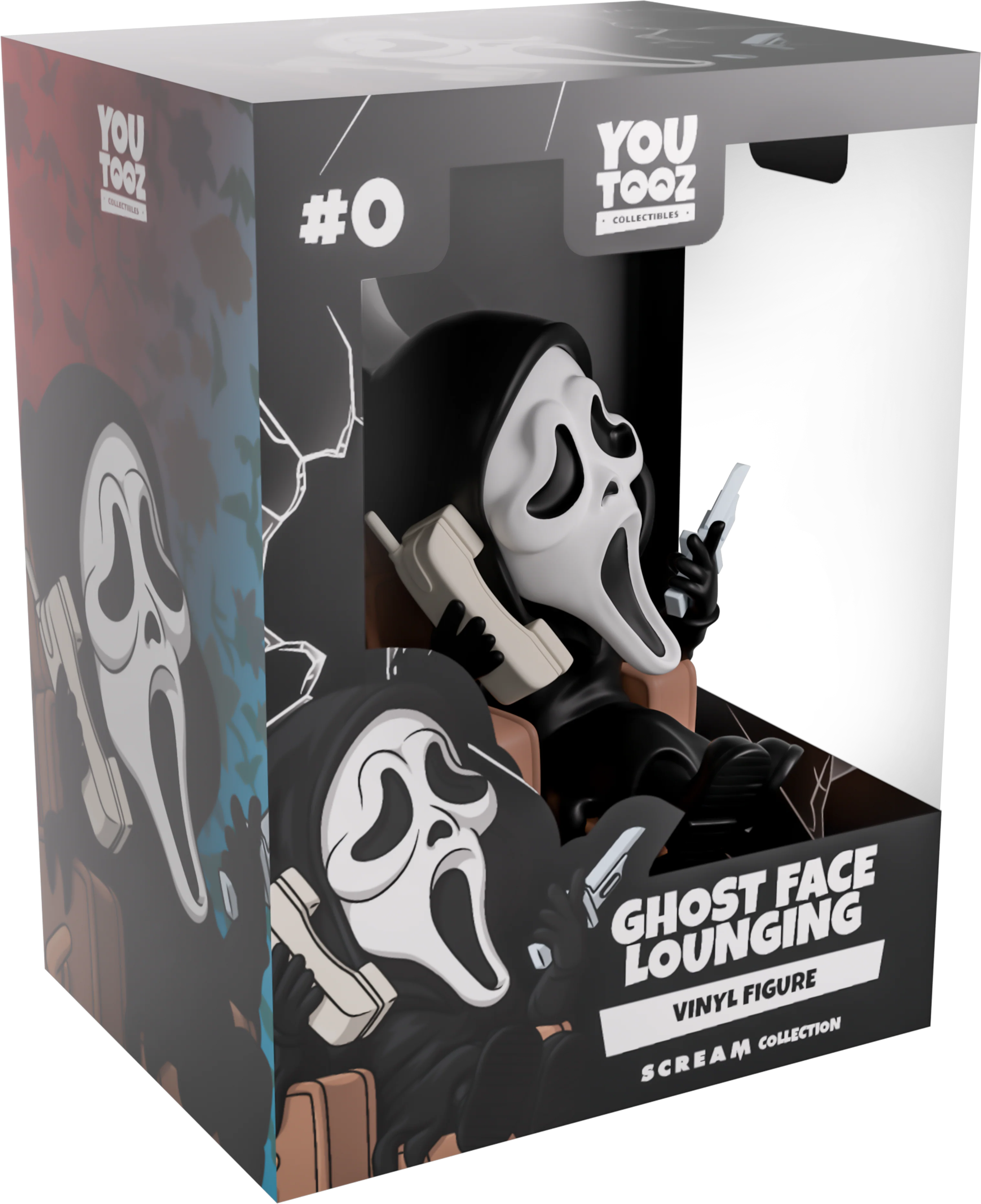 Wait, who’s that on the phone? And why are they asking about returning to Youtooz?! Ghost Face is back to keep it chill as he kicks back on the comfiest brown recliner to sit at 4.1 inches tall with his feet hanging over the edge of the extended footrest and holding an old school phone up to his ear. Nonchalantly flicking a knife to the side and wearing his iconic white mask with slanted eyes and an elongated open mouth, his body is covered in a long black cloak that flows from his head down to booted feet. The exterior see’s Ghost Face leaning back and enjoying some snacks as he’s illuminated by a TV screen. While the pitch-black interior cracks with shattered glass as his white mask peers through the shadows, this then continues onto the protective sleeve where his figure can be seen through the large clear window at the packaging’s front. This collectible ships in a matte, embossed, protective outer sleeve and a custom-sized plastic protector for maximum protection during shipping.